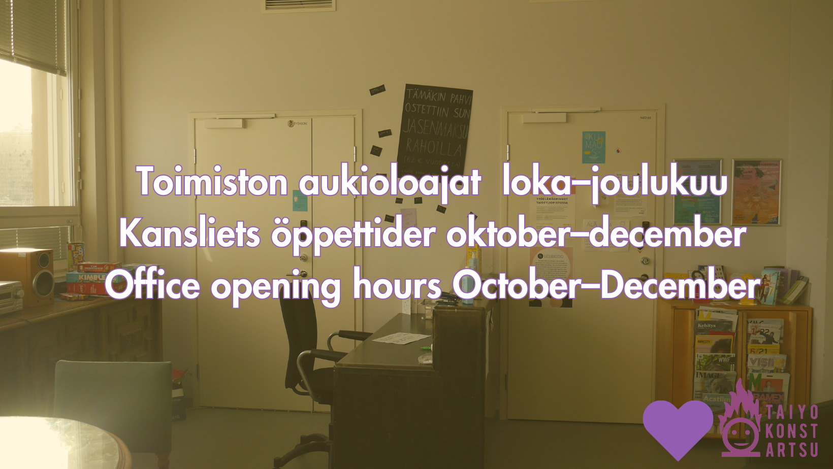 or by agreement, contact us via email taiyo-toimisto@uniarts.fi